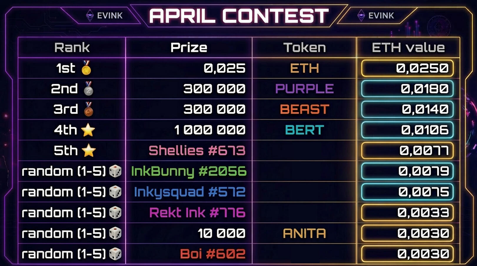 Rules :➡️ Simple formula : points = (evink bought - evink sold) × your evink april contest nft countFrom april 1st to april 30th0 nft = 0 points (no entry)